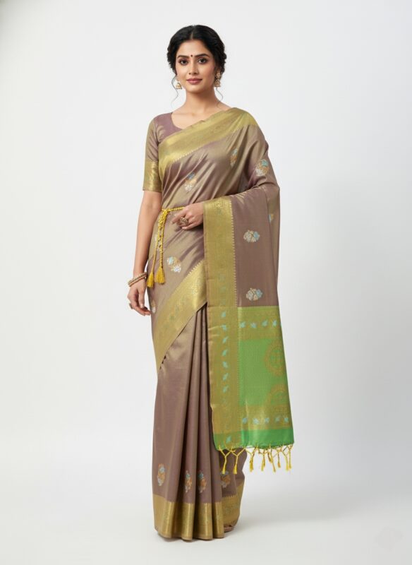 Taupe Brown Silk Saree with Olive Zari Pallu