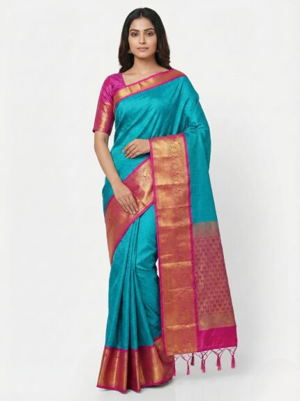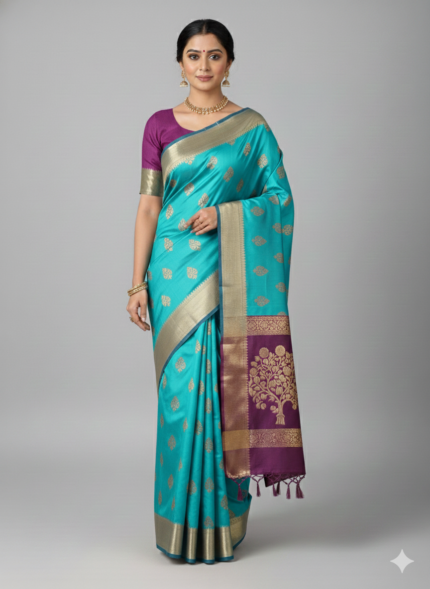 Teal Blue Silk Saree with Purple Zari Tree Motif Pallu