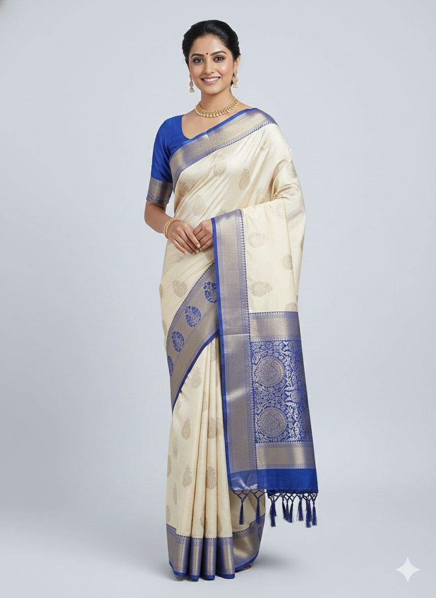 Elegant ivory silk saree with subtle woven motifs and a rich royal blue zari border.