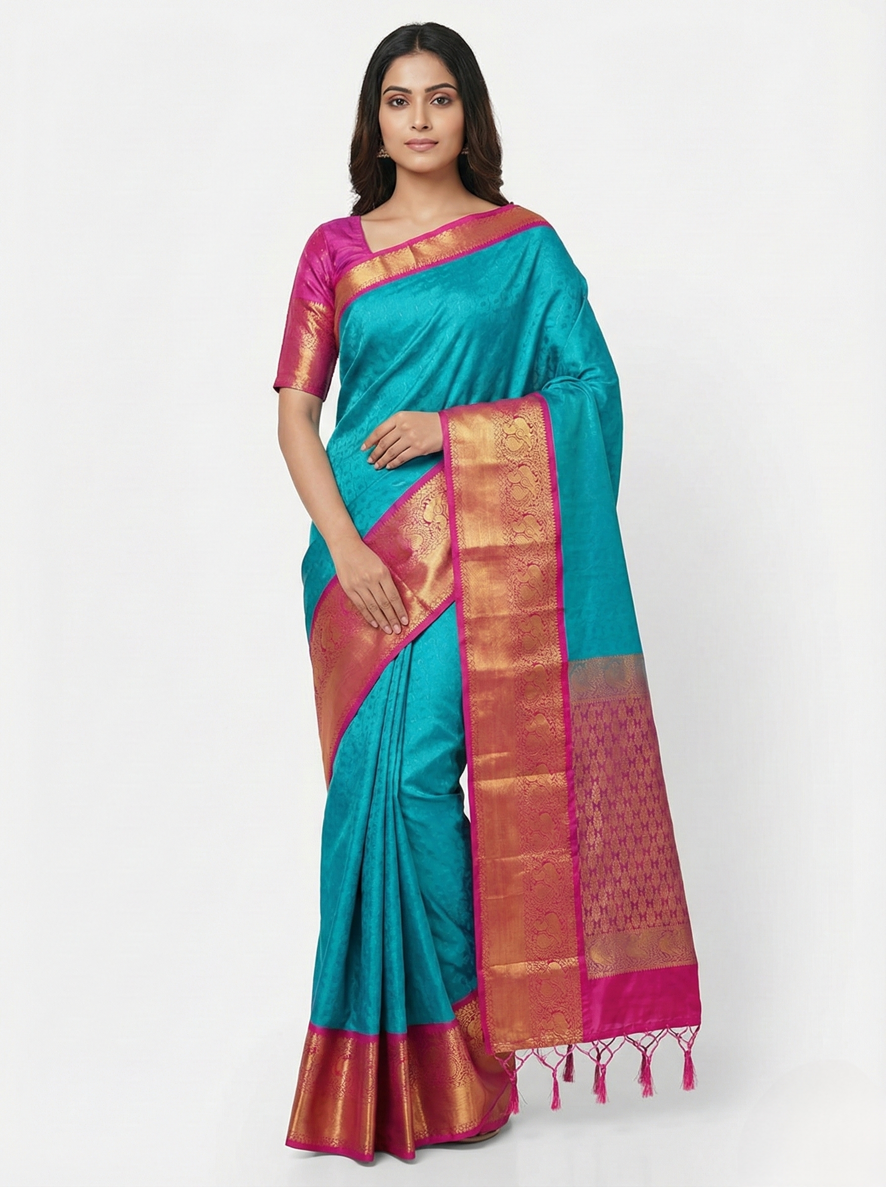 This teal blue silk saree features a smooth silk body enhanced with a bold magenta zari border and traditional woven motifs. Perfect for weddings, festivals, and formal family functions. Drapes beautifully with a premium silk finish.